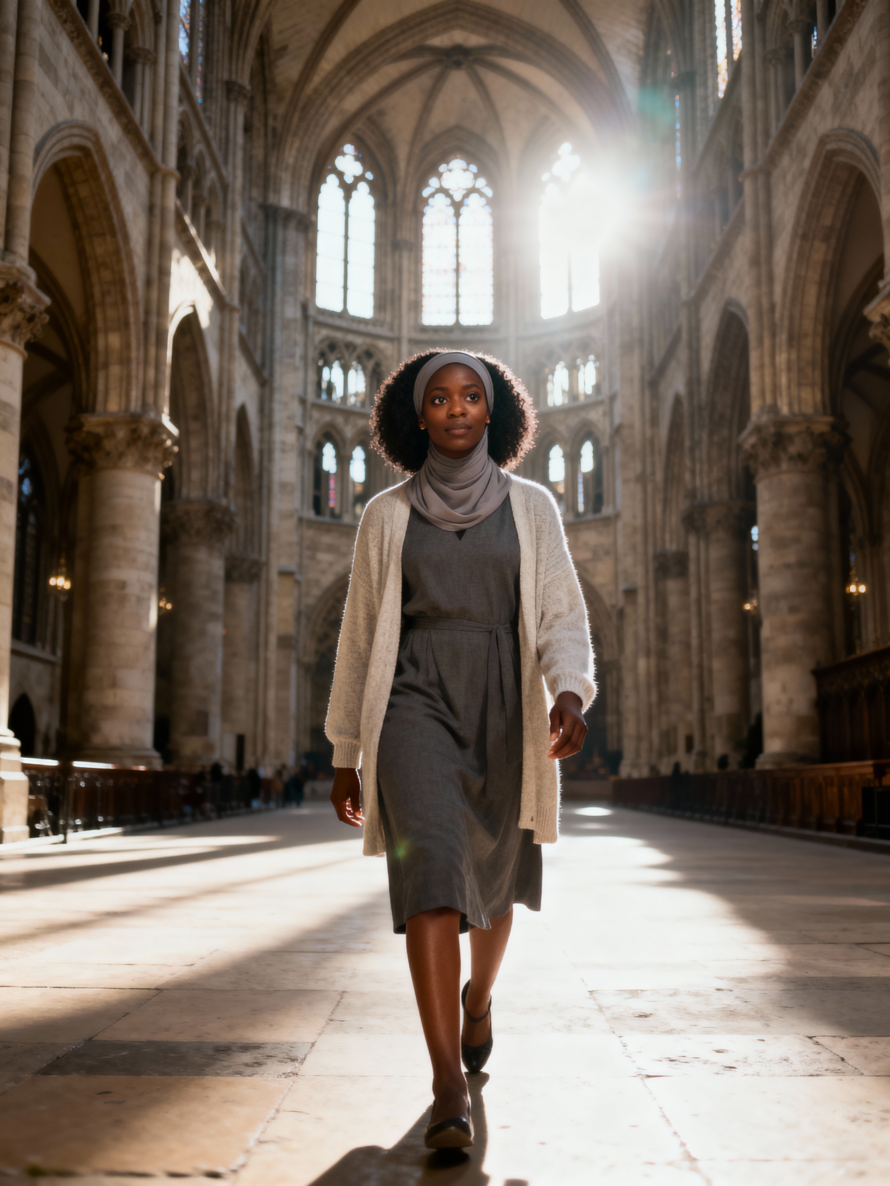 model at Notre-Dame Cathedral, wearing a respectful modest outfit with light cardigan , walking through historic architecture