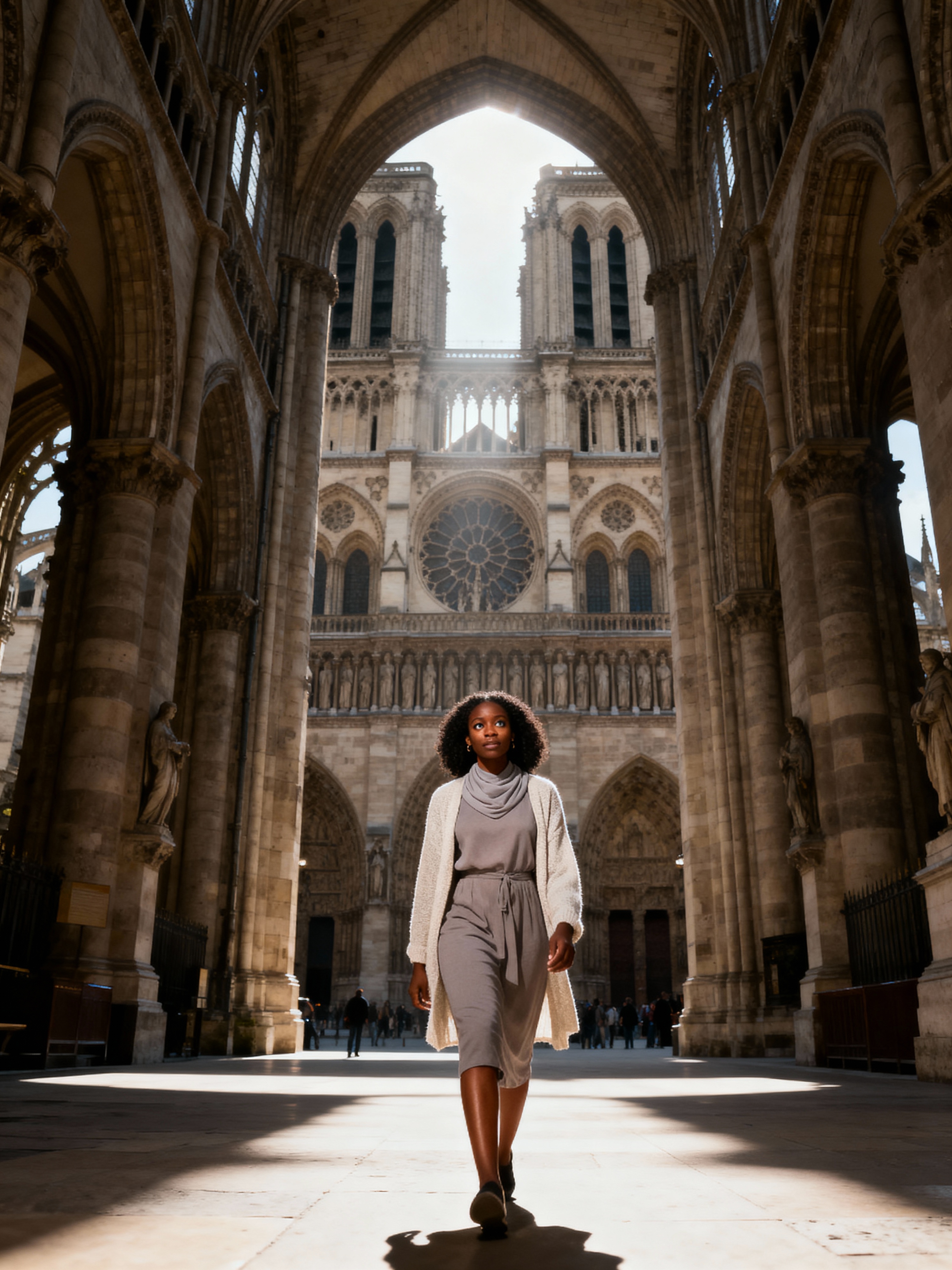 model at Notre-Dame Cathedral, wearing a respectful modest outfit with light cardigan , walking through historic architecture