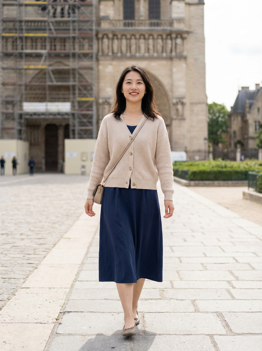 model at Notre-Dame Cathedral, wearing a respectful modest outfit with light cardigan , walking through historic architecture