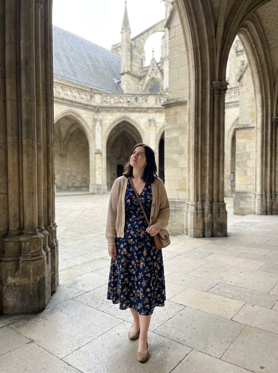 model at Notre-Dame Cathedral, wearing a respectful modest outfit with light cardigan , walking through historic architecture