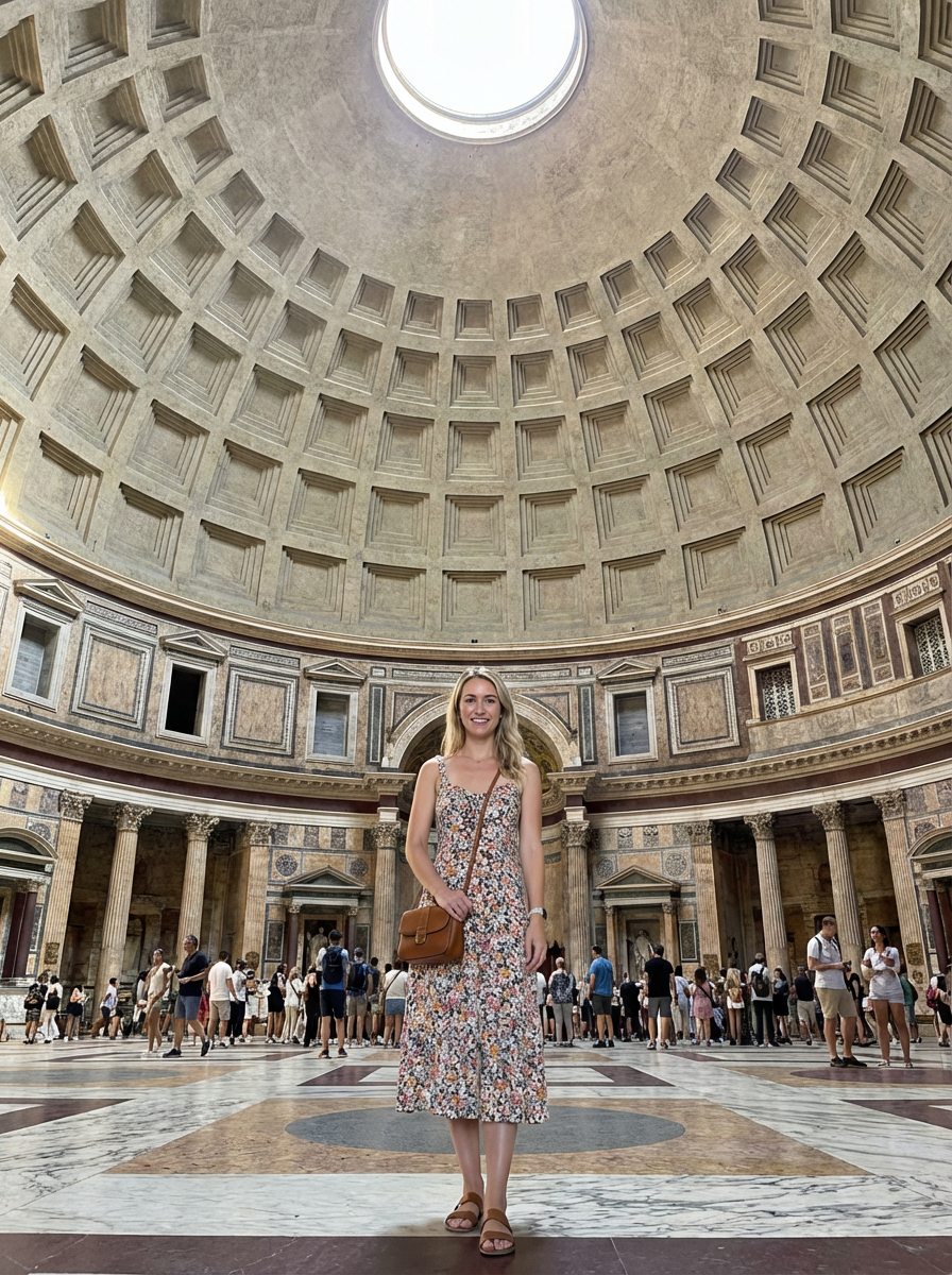 model at Pantheon, impressive dome, stylish summer attire, piazza scene