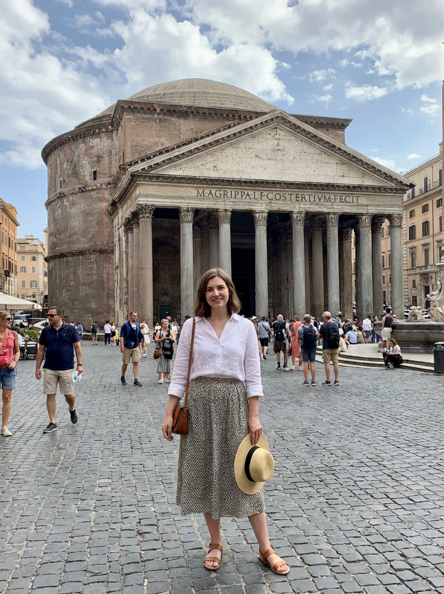 model at Pantheon, impressive dome, stylish summer attire, piazza scene