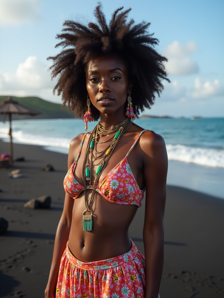model at Perissa Black Beach, wearing a trendy beach outfit with colorful accessories , black volcanic sand and beach umbrellas