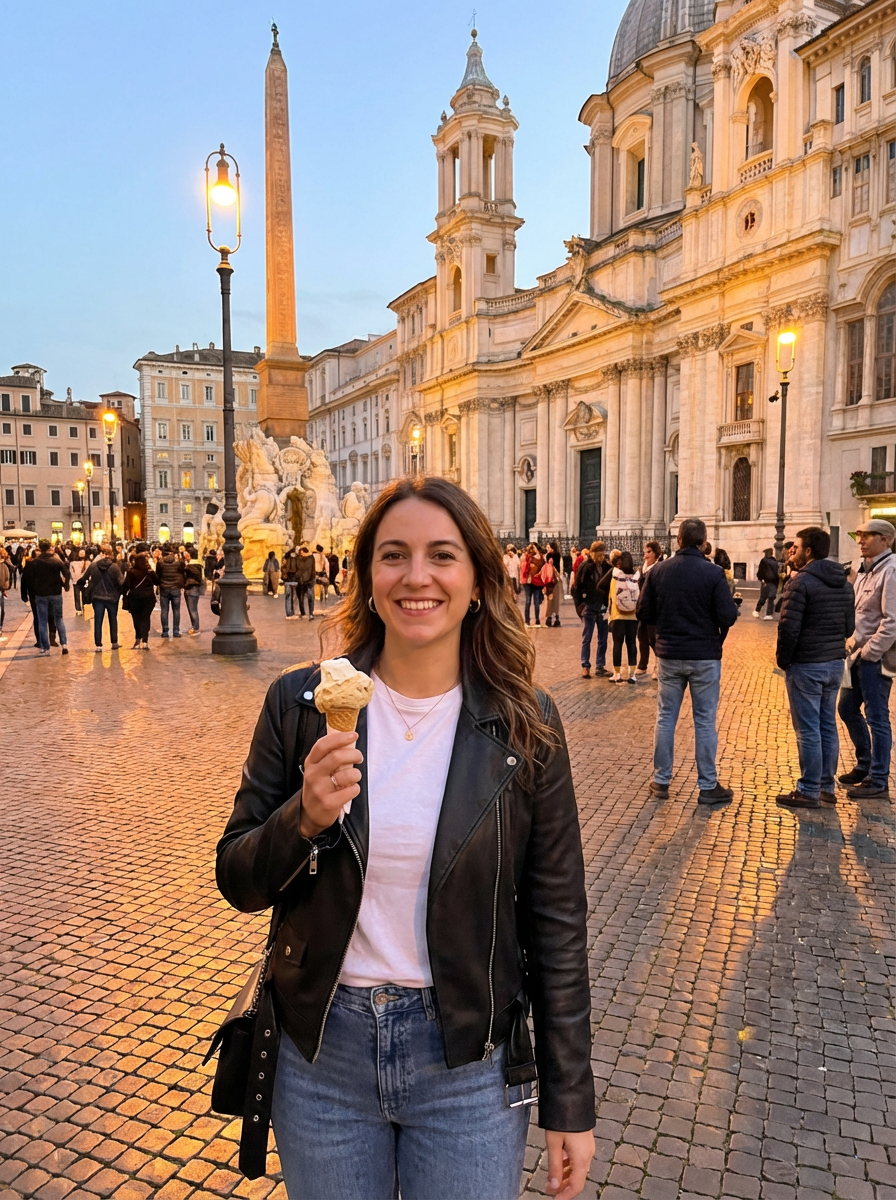 model at Piazza Navona, baroque fountains, evening passeggiata style, romantic atmosphere