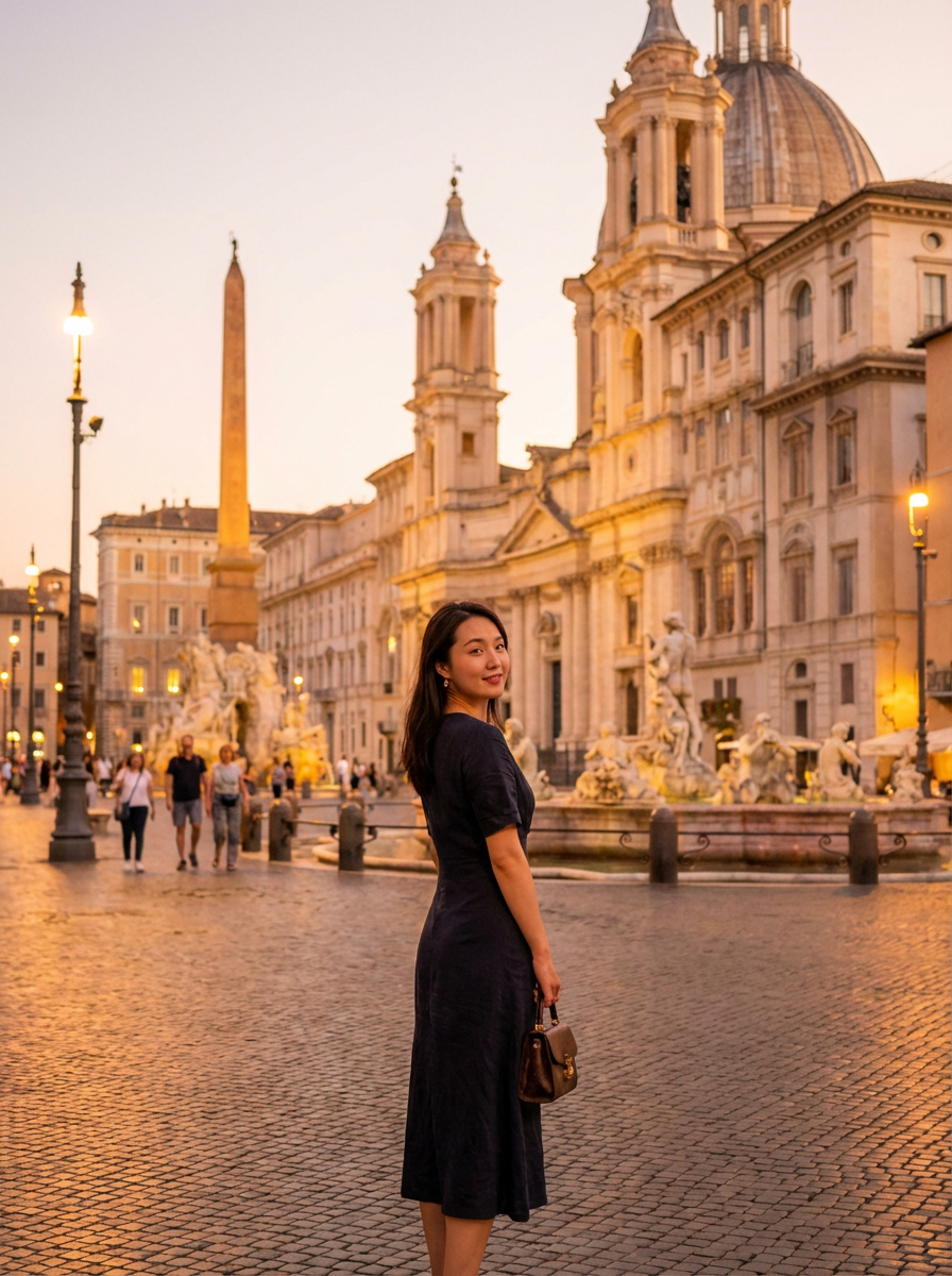 model at Piazza Navona, baroque fountains, evening passeggiata style, romantic atmosphere