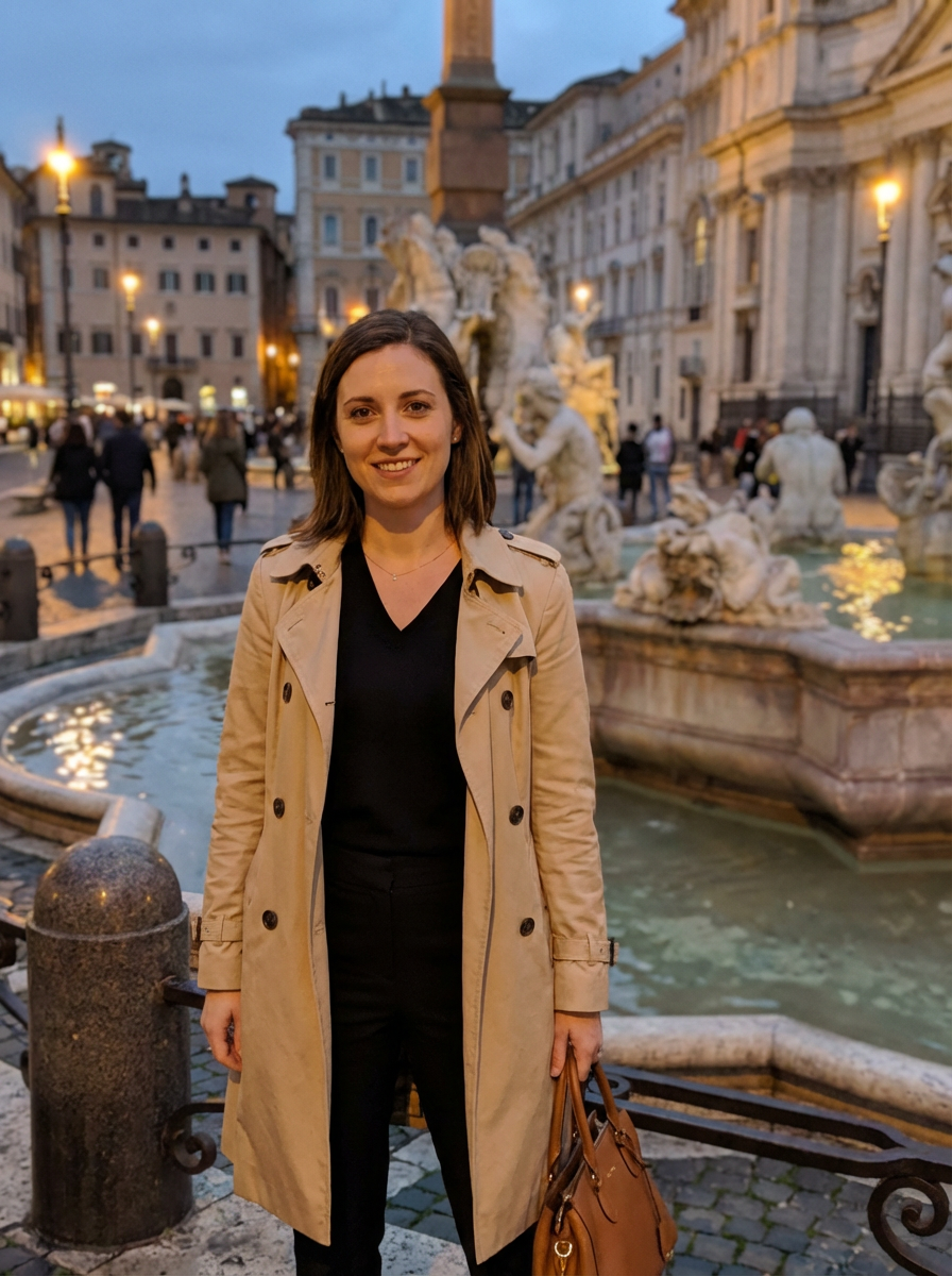 model at Piazza Navona, baroque fountains, evening passeggiata style, romantic atmosphere