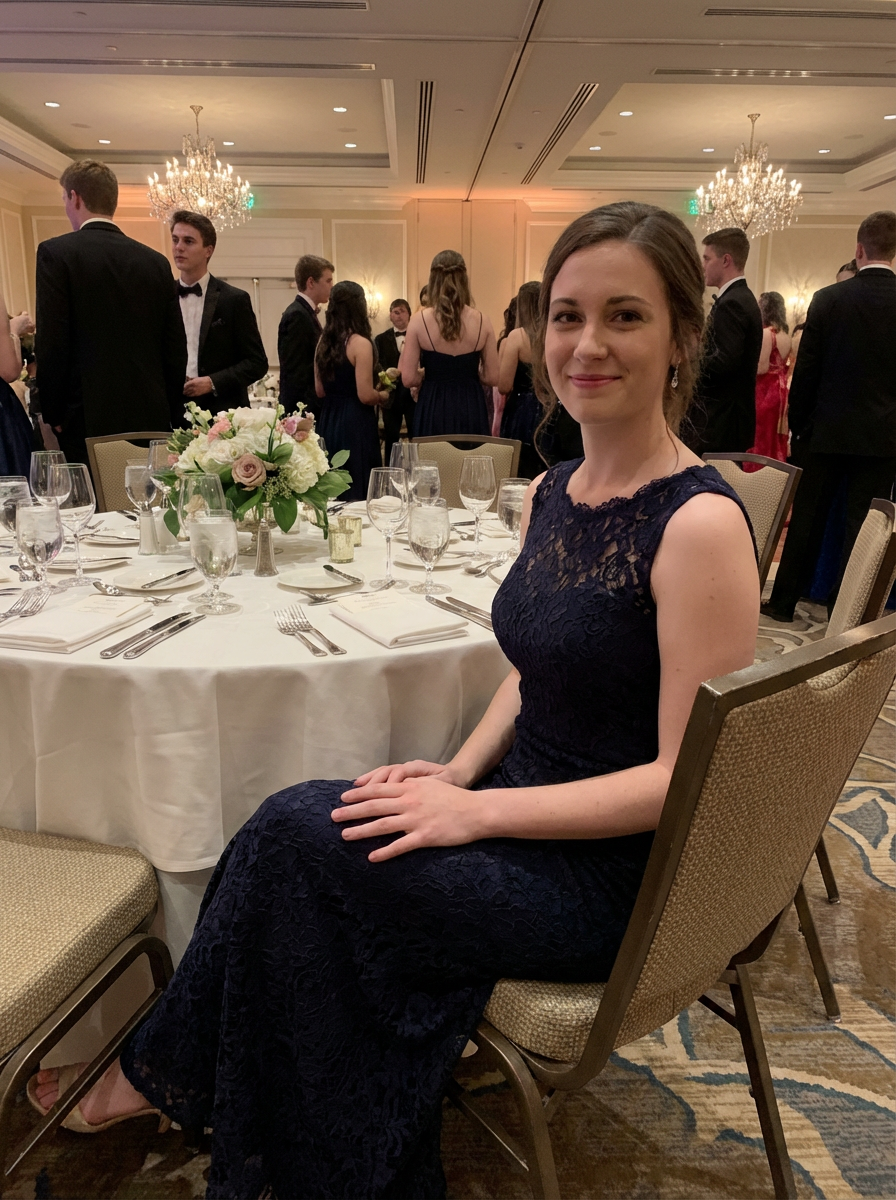 model at prom dinner table, elegant venue setting, formal attire, sophisticated teenage moment