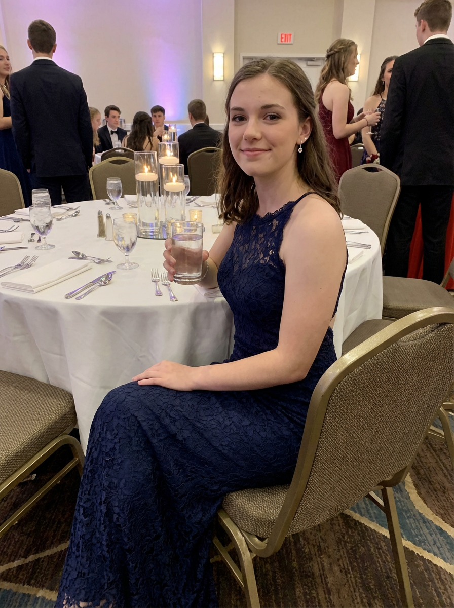model at prom dinner table, elegant venue setting, formal attire, sophisticated teenage moment