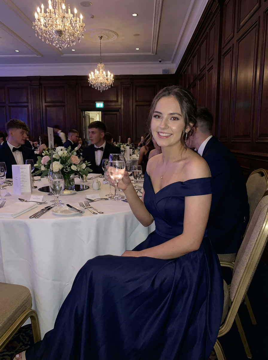 model at prom dinner table, elegant venue setting, formal attire, sophisticated teenage moment