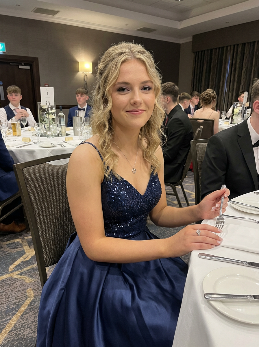 model at prom dinner table, elegant venue setting, formal attire, sophisticated teenage moment