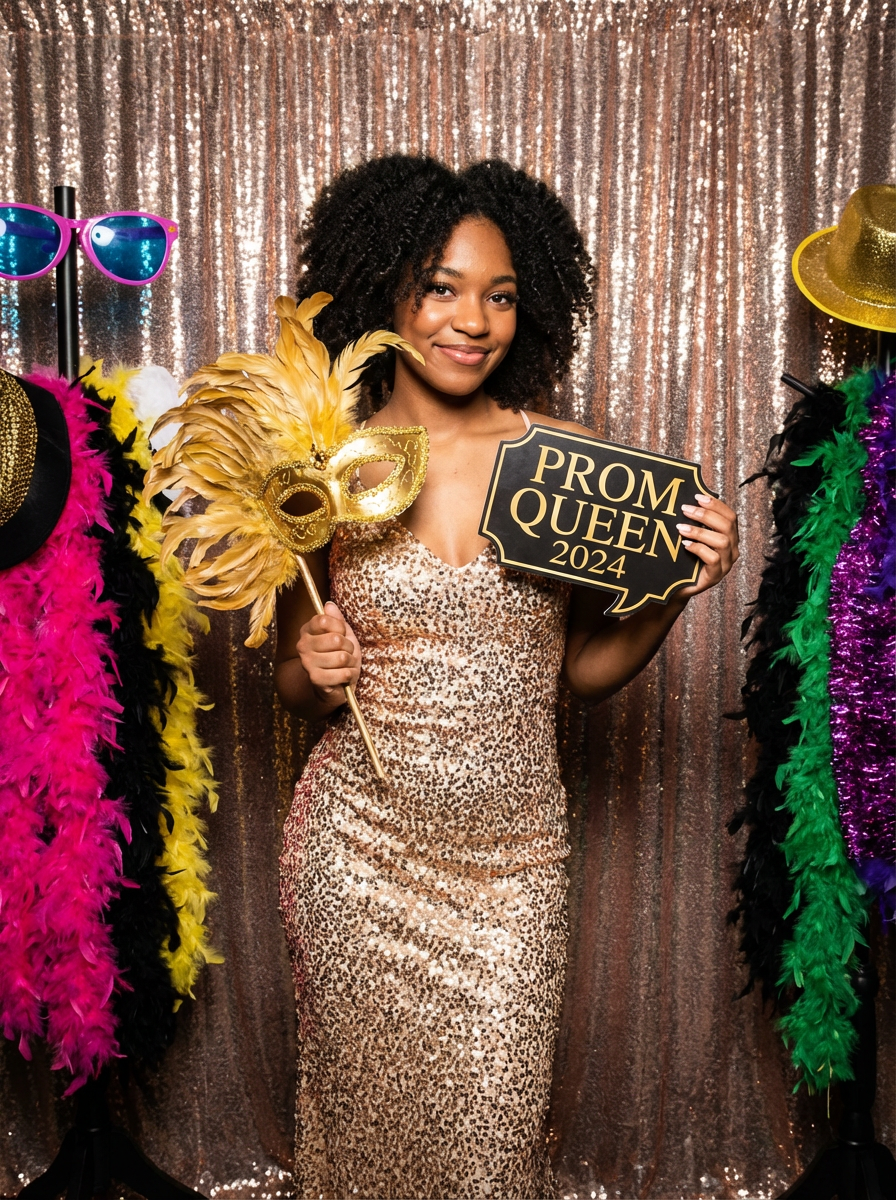 model at prom photo booth, fun props, glamorous prom look , playful poses