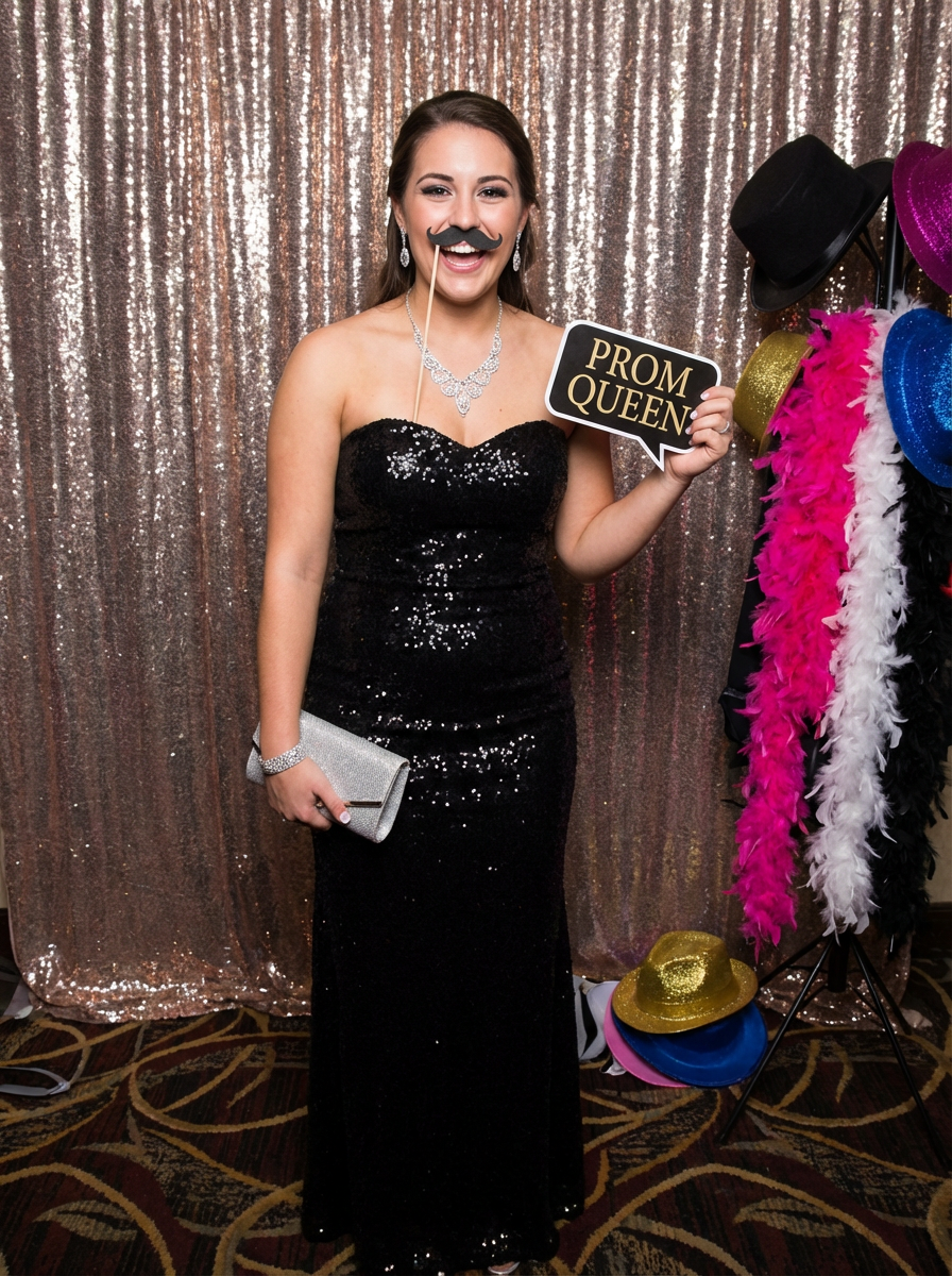 model at prom photo booth, fun props, glamorous prom look , playful poses
