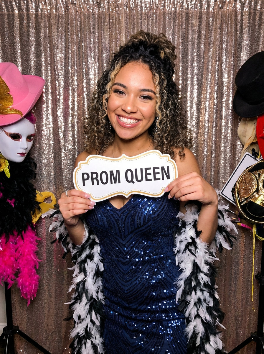 model at prom photo booth, fun props, glamorous prom look , playful poses
