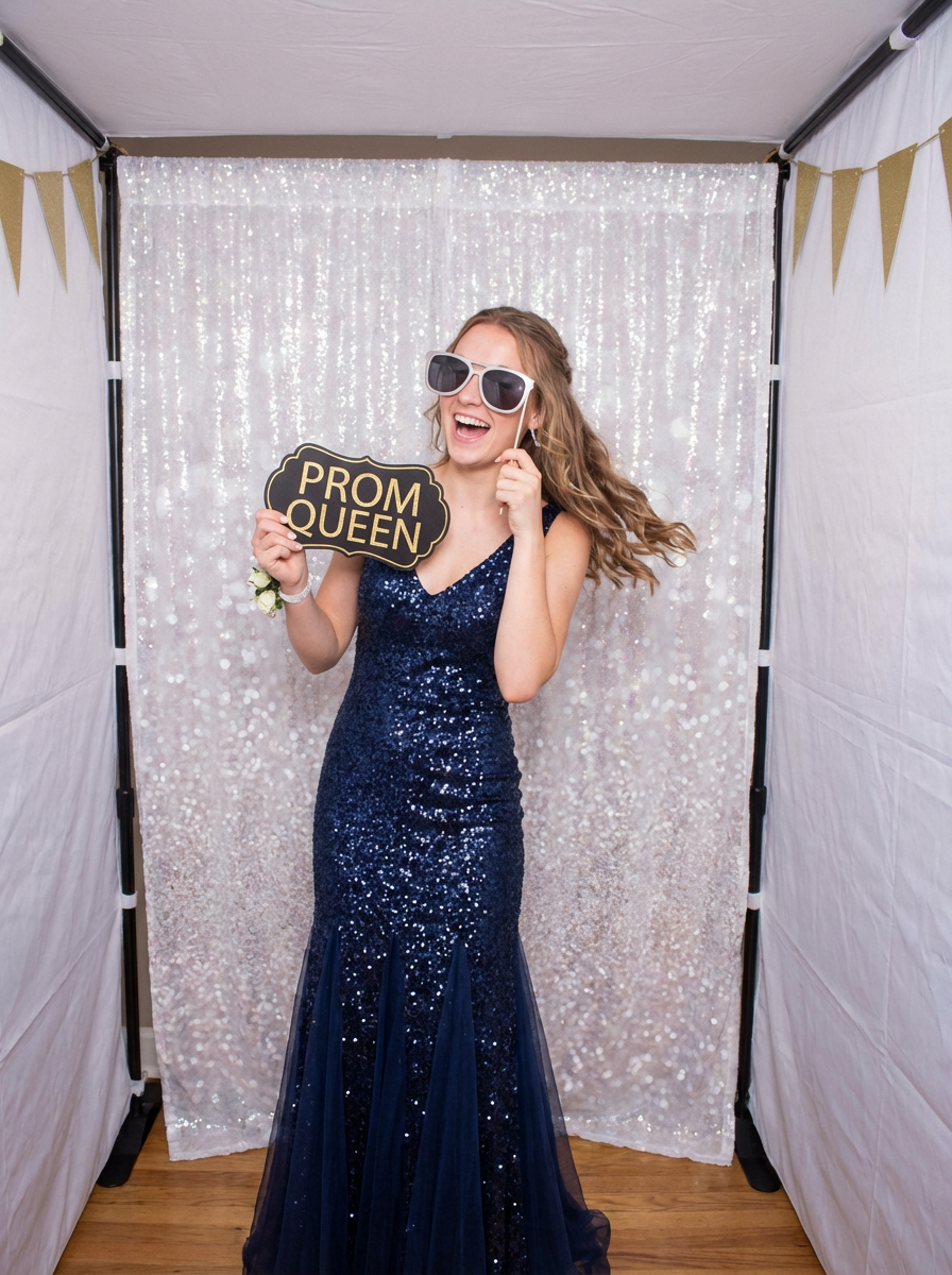 model at prom photo booth, fun props, glamorous prom look , playful poses