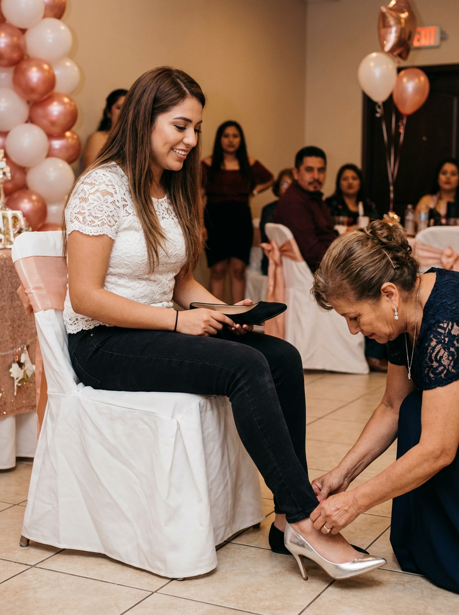 model at quinceanera ceremony, changing shoes ritual, from flats to heels, meaningful tradition moment