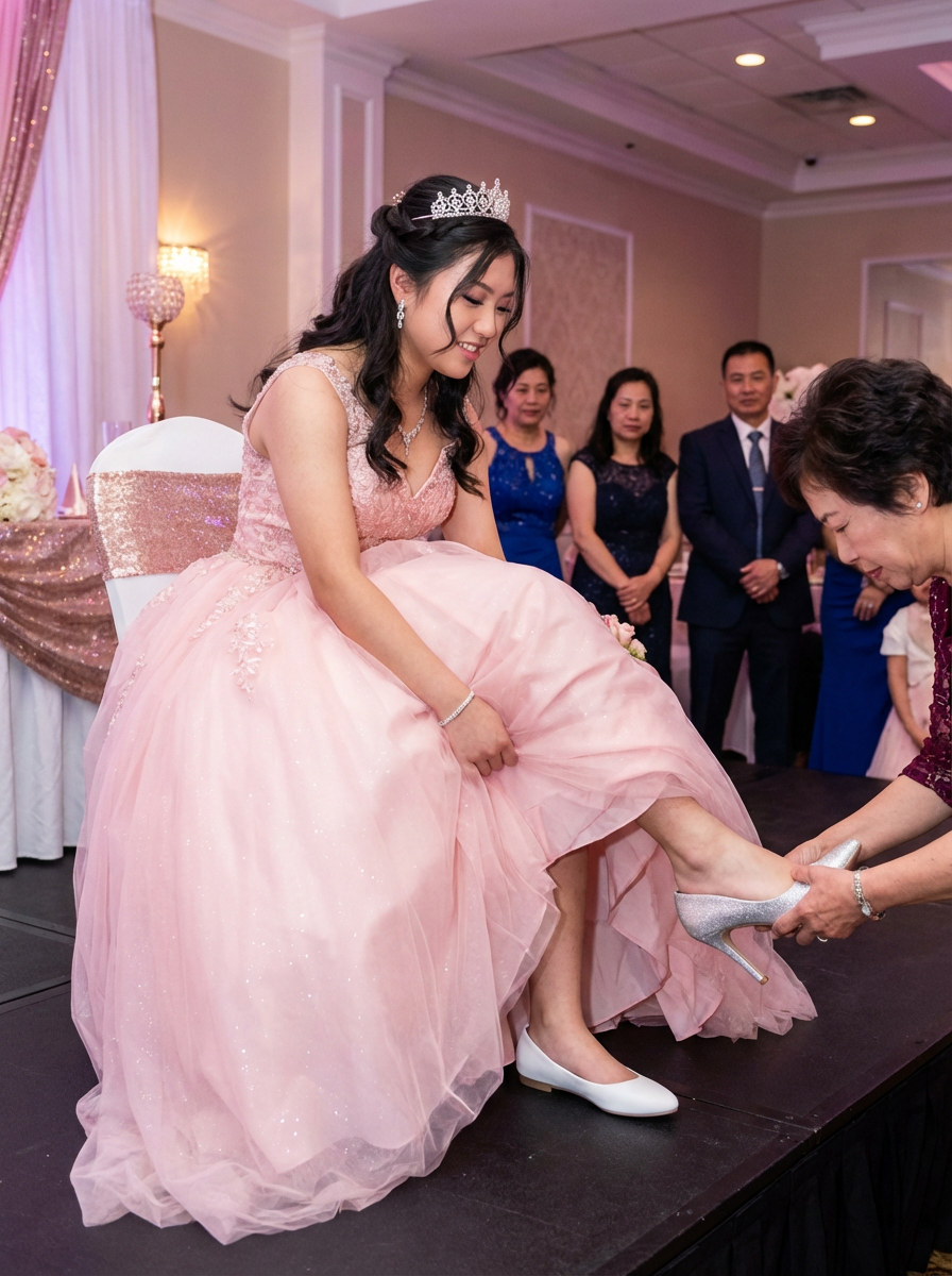 model at quinceanera ceremony, changing shoes ritual, from flats to heels, meaningful tradition moment