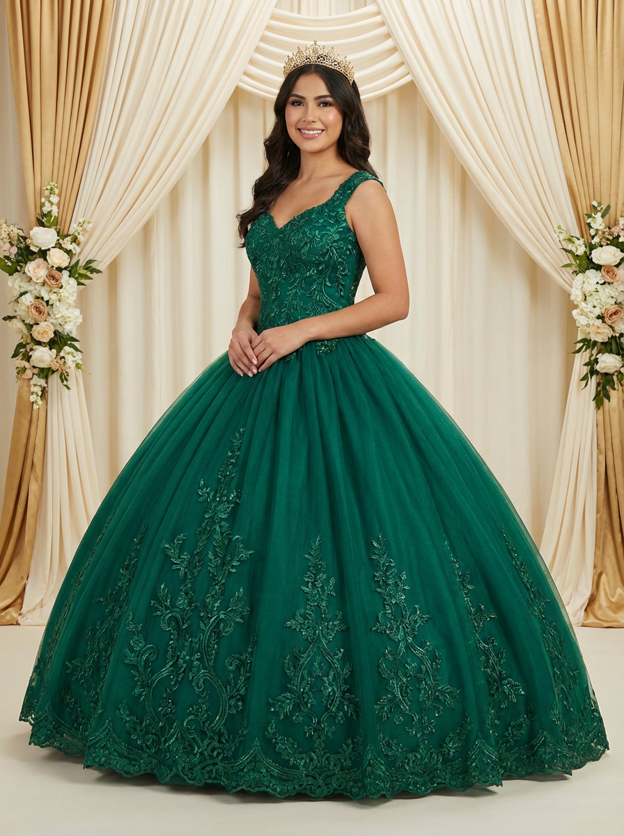 model at quinceanera photo session, professional portrait, stunning dress and tiara, elegant backdrop
