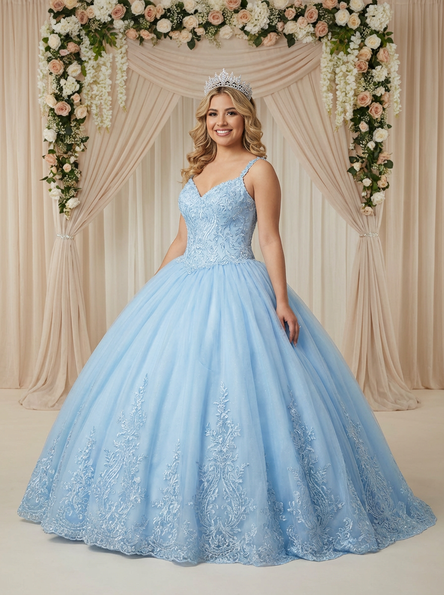 model at quinceanera photo session, professional portrait, stunning dress and tiara, elegant backdrop