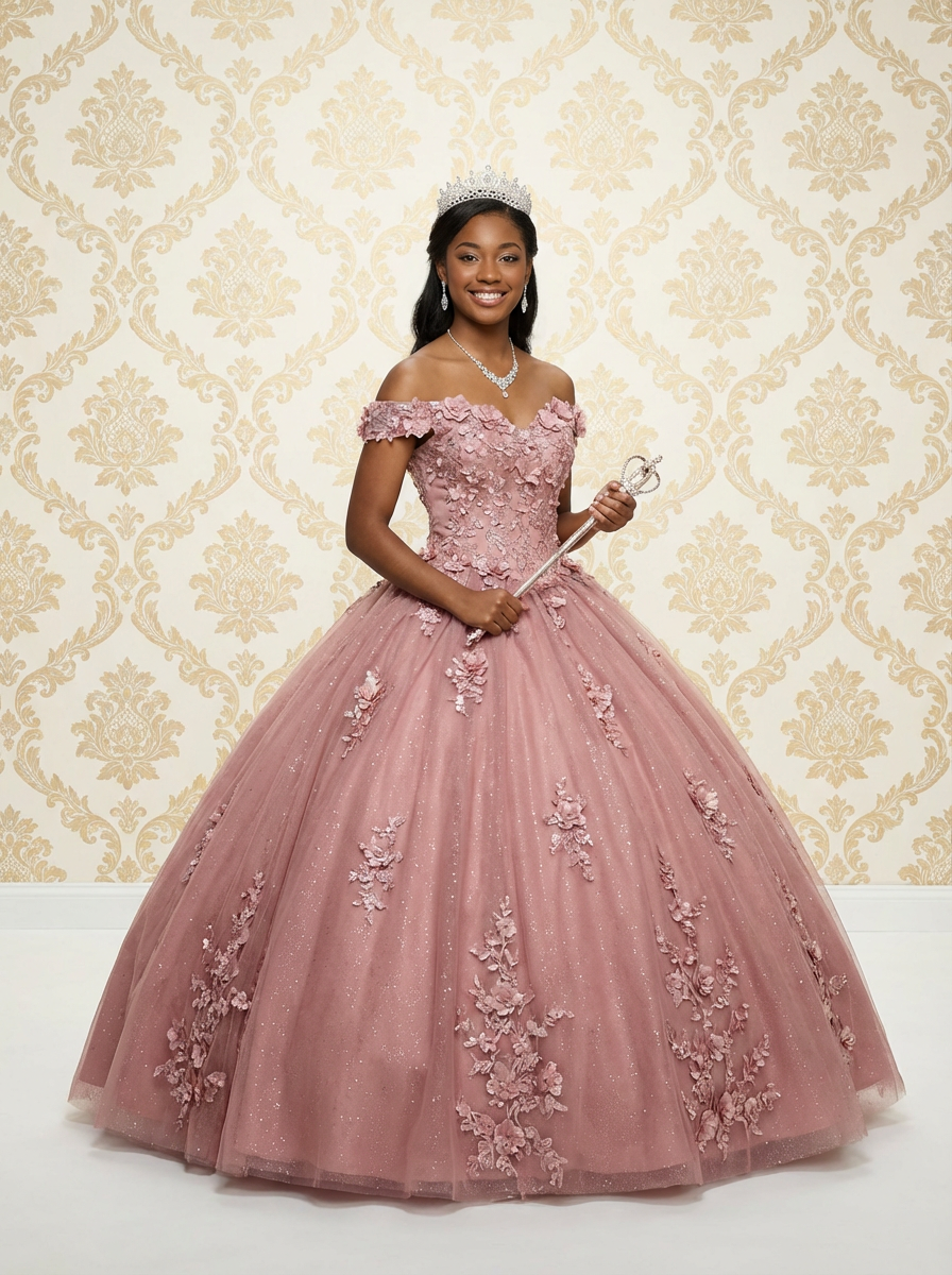 model at quinceanera photo session, professional portrait, stunning dress and tiara, elegant backdrop