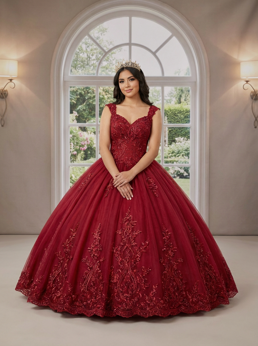 model at quinceanera photo session, professional portrait, stunning dress and tiara, elegant backdrop