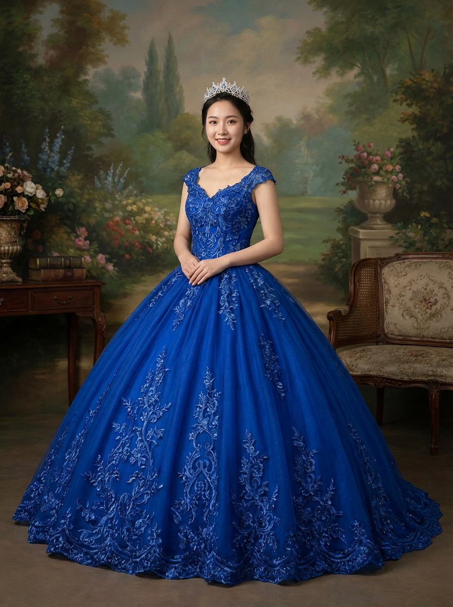 model at quinceanera photo session, professional portrait, stunning dress and tiara, elegant backdrop