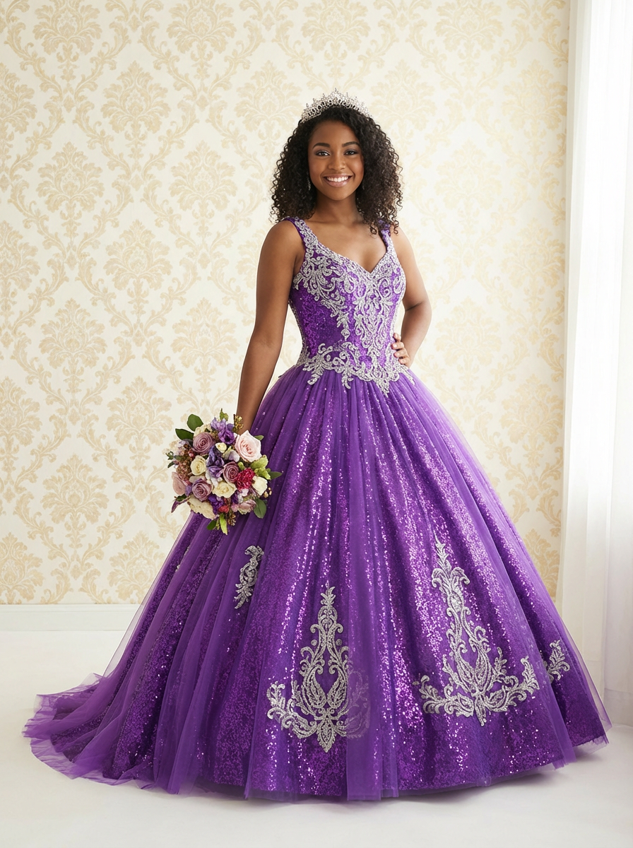 model at quinceanera photo session, professional portrait, stunning dress and tiara, elegant backdrop