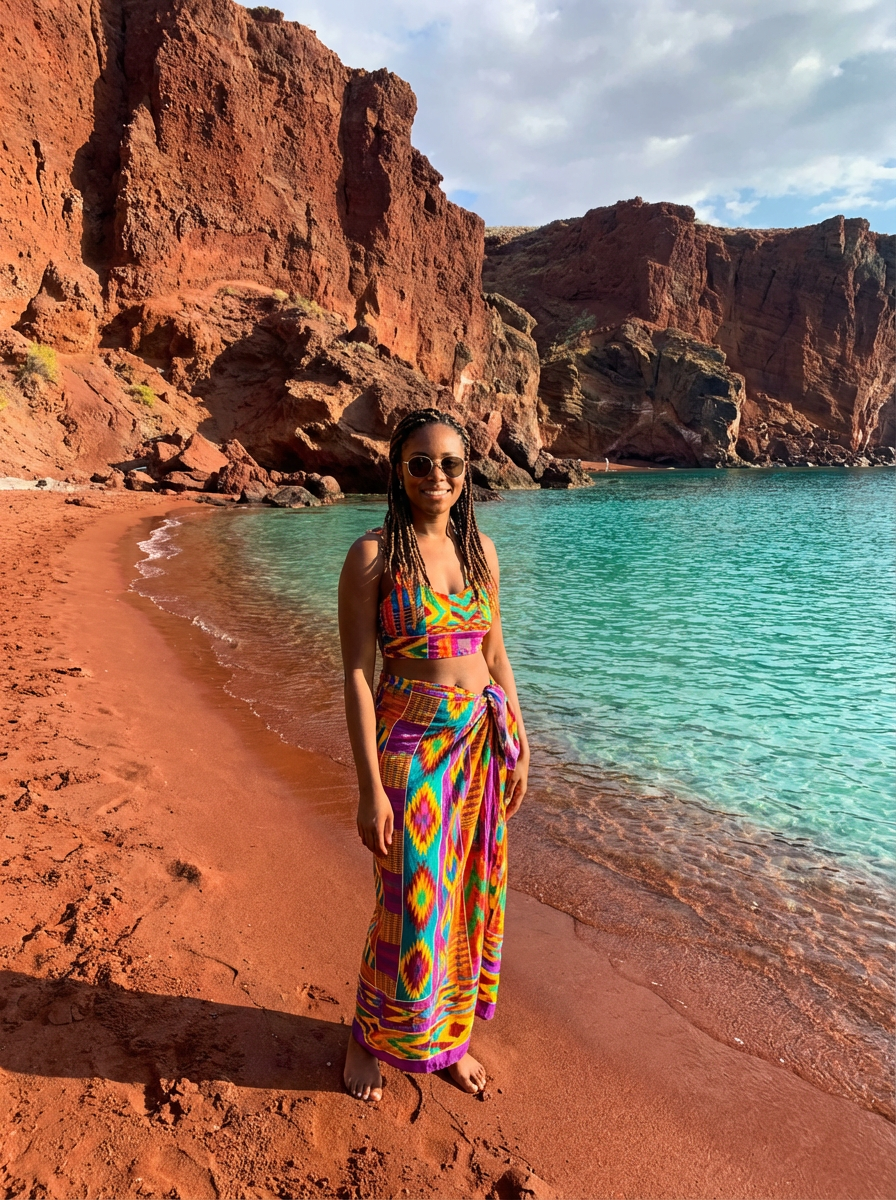 model at Red Beach, wearing a colorful beach outfit with sunglasses , dramatic red cliffs and crystal clear waters