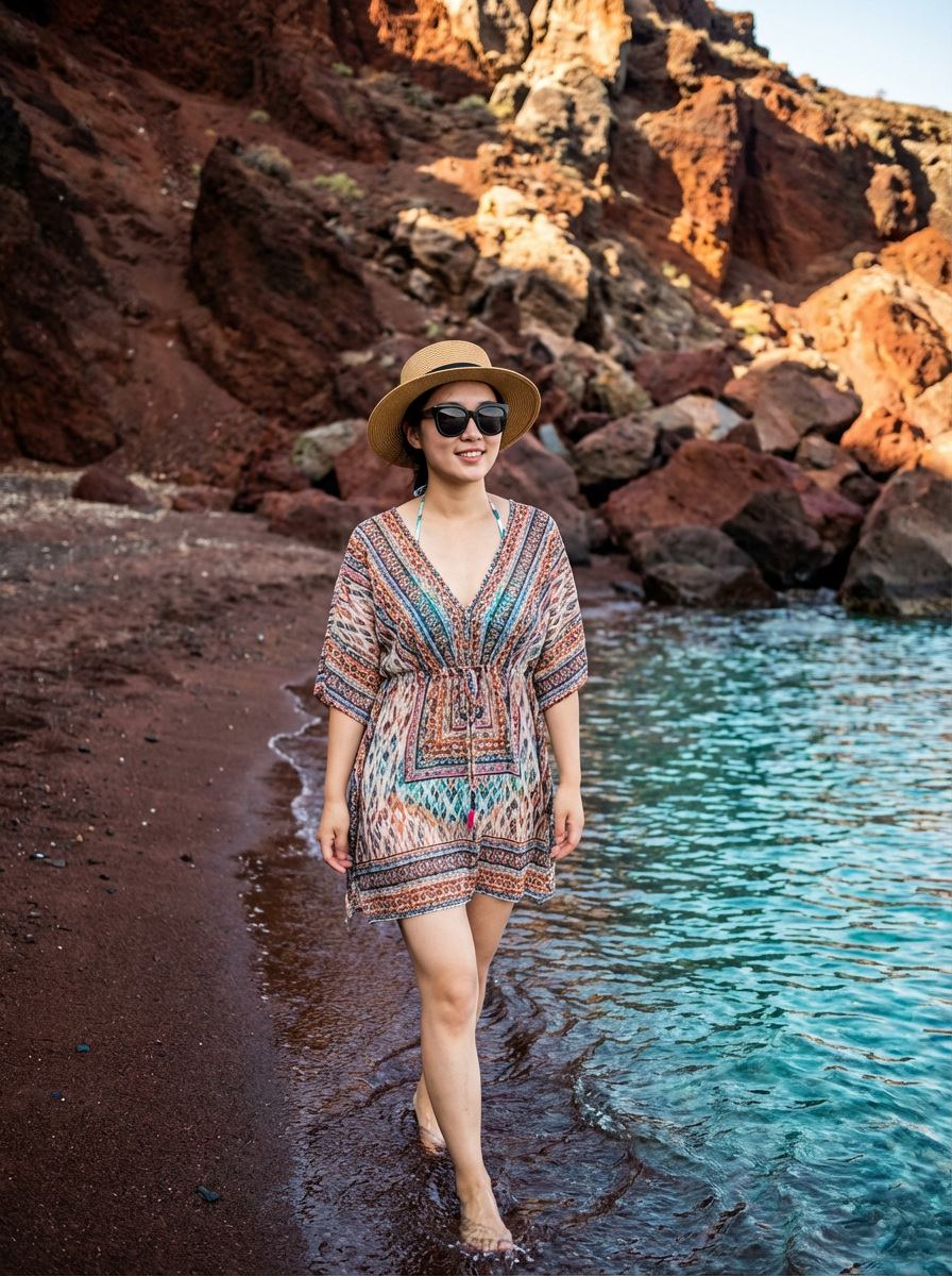 model at Red Beach, wearing a colorful beach outfit with sunglasses , dramatic red cliffs and crystal clear waters