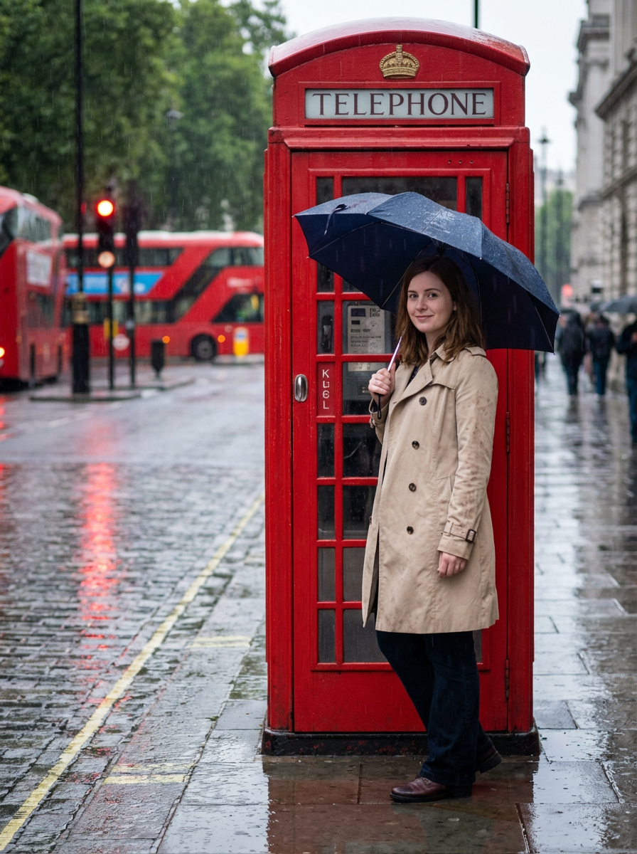 model at red telephone box, classic London icon, trench coat , rainy day aesthetic