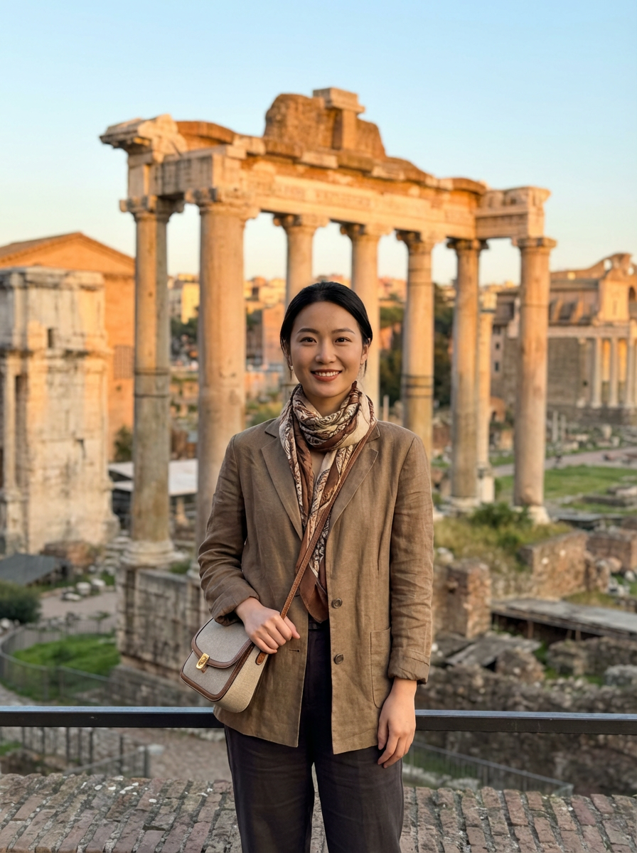 model at Roman Forum ruins, ancient history backdrop, stylish tourist outfit, warm lighting