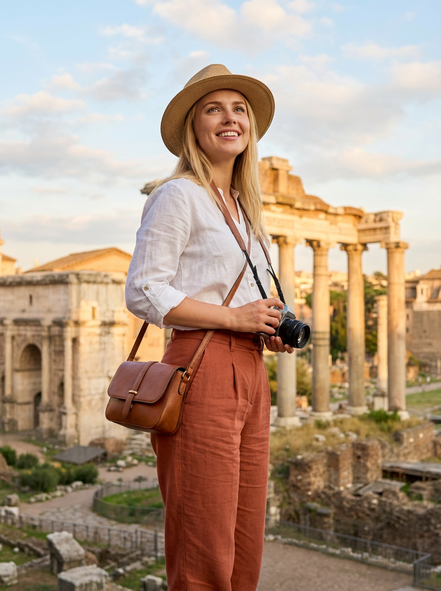 model at Roman Forum ruins, ancient history backdrop, stylish tourist outfit, warm lighting