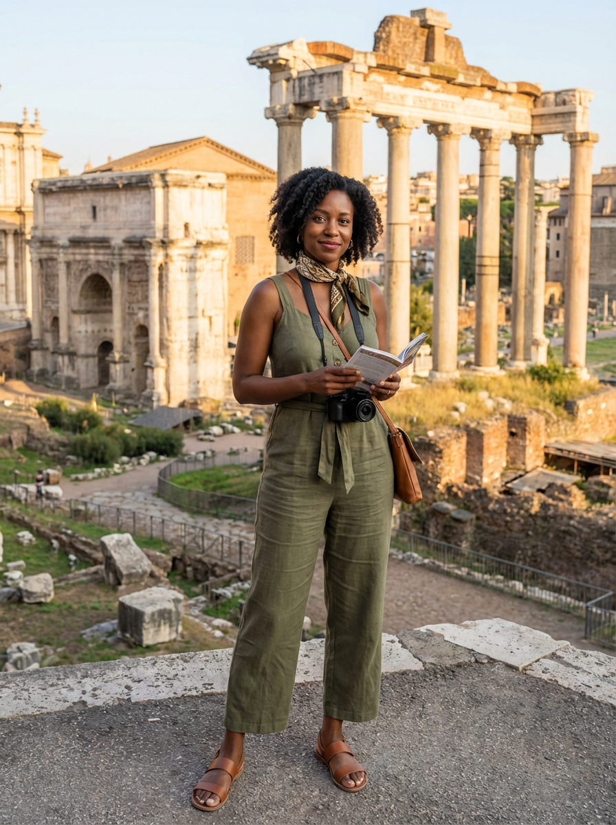 model at Roman Forum ruins, ancient history backdrop, stylish tourist outfit, warm lighting