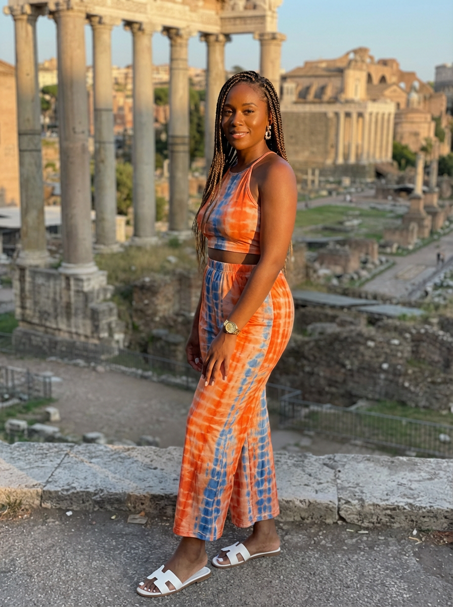 model at Roman Forum ruins, ancient history backdrop, stylish tourist outfit, warm lighting