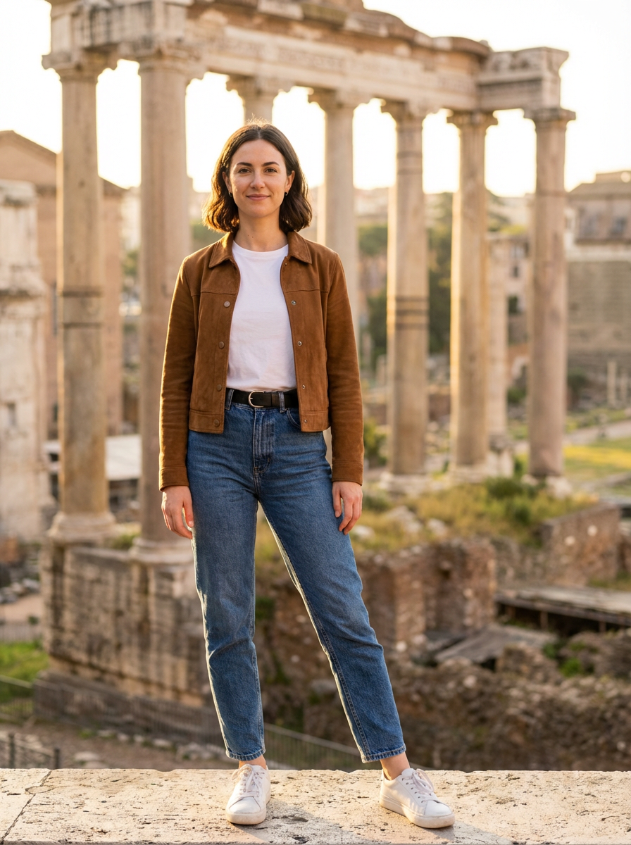 model at Roman Forum ruins, ancient history backdrop, stylish tourist outfit, warm lighting