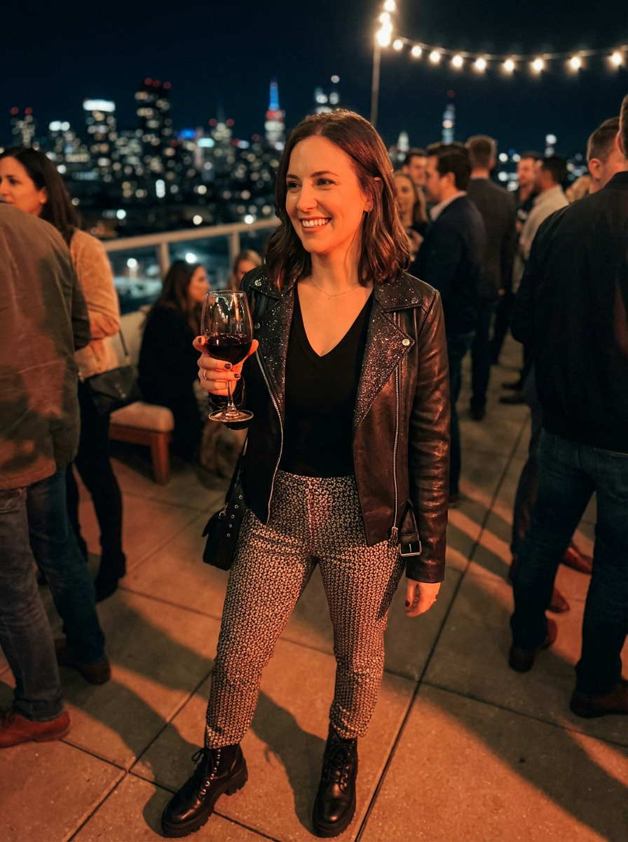 model at rooftop party, social creative scene, fashionable unique outfit, city night lights