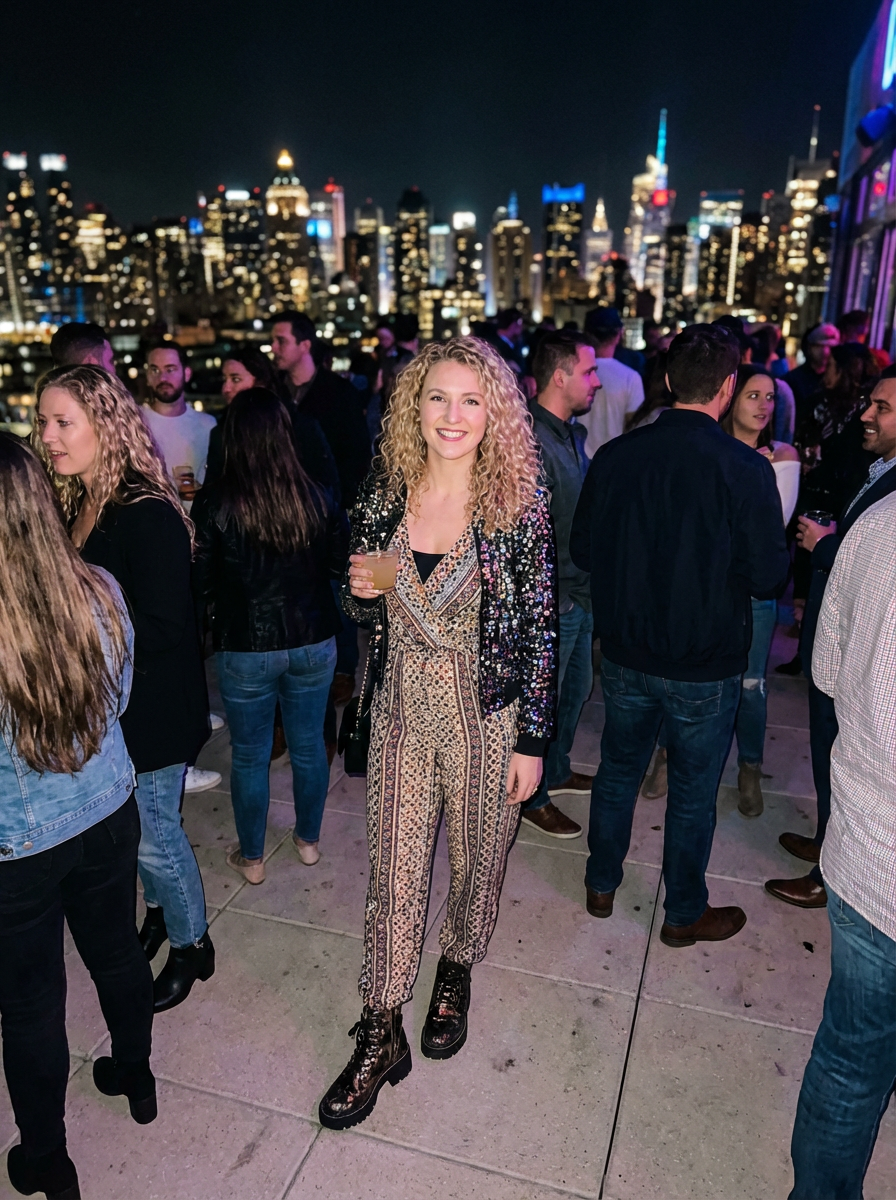 model at rooftop party, social creative scene, fashionable unique outfit, city night lights