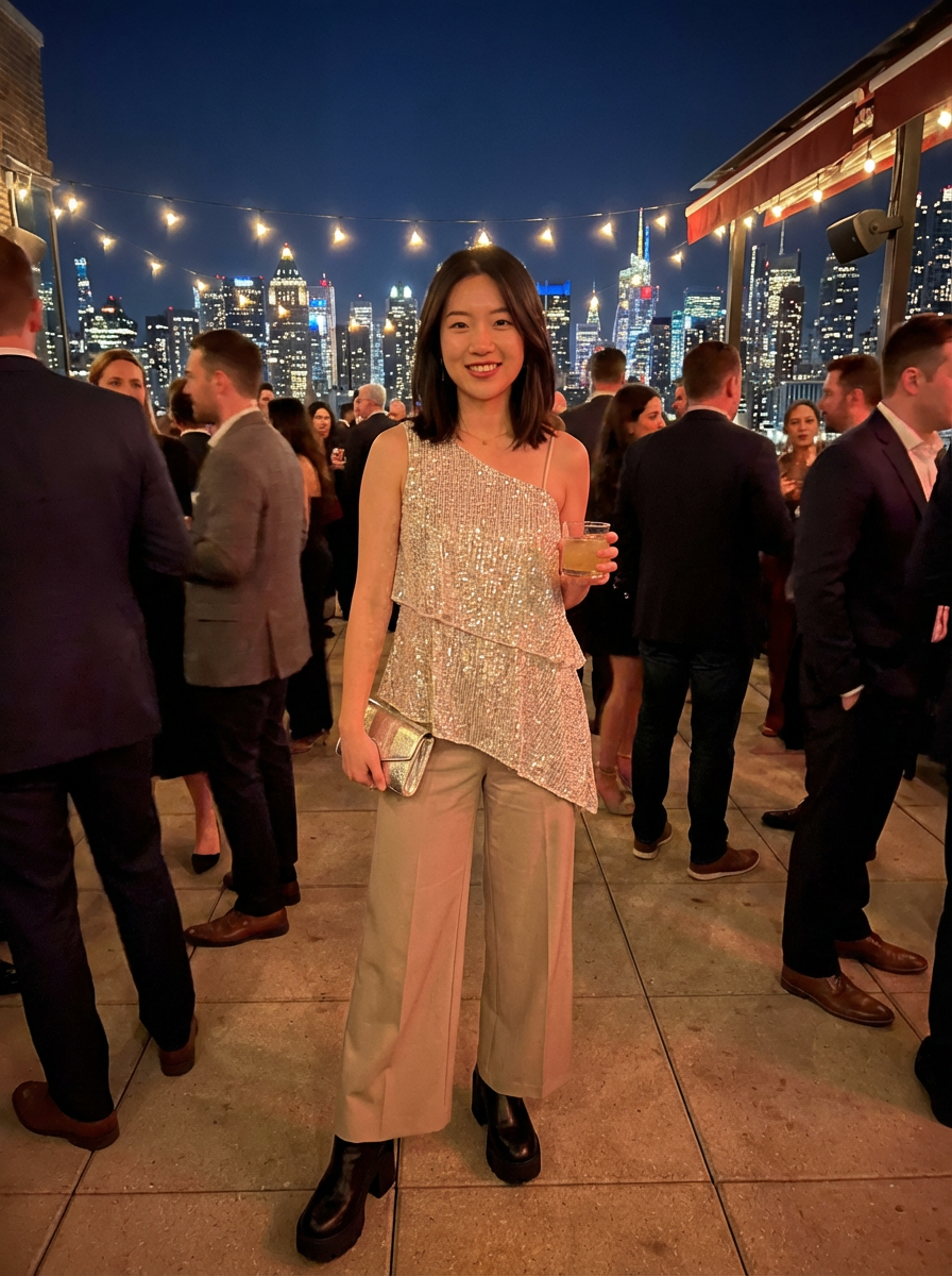 model at rooftop party, social creative scene, fashionable unique outfit, city night lights