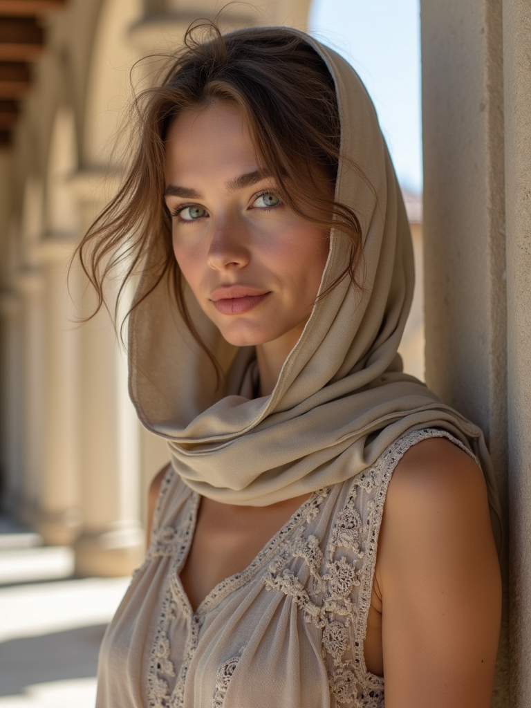 model at Sacré-Cœur Basilica, wearing a modest summer dress with light scarf , traditional architecture visible