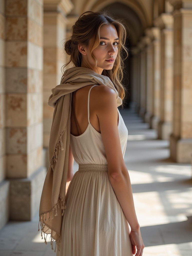 model at Sacré-Cœur Basilica, wearing a modest summer dress with light scarf , traditional architecture visible