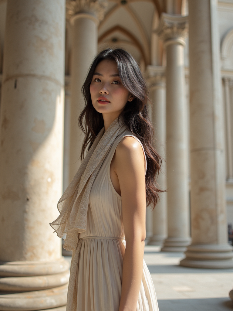 model at Sacré-Cœur Basilica, wearing a modest summer dress with light scarf , traditional architecture visible