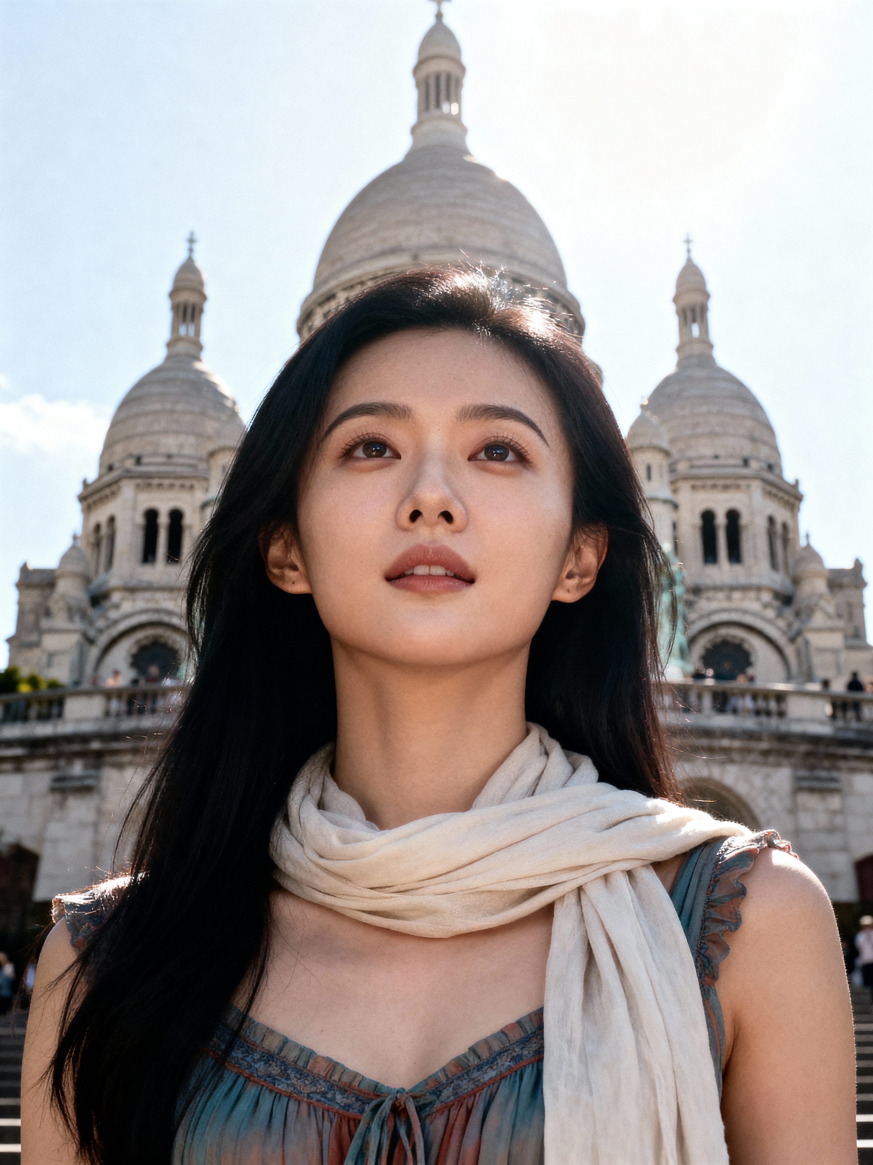 model at Sacré-Cœur Basilica, wearing a modest summer dress with light scarf , traditional architecture visible