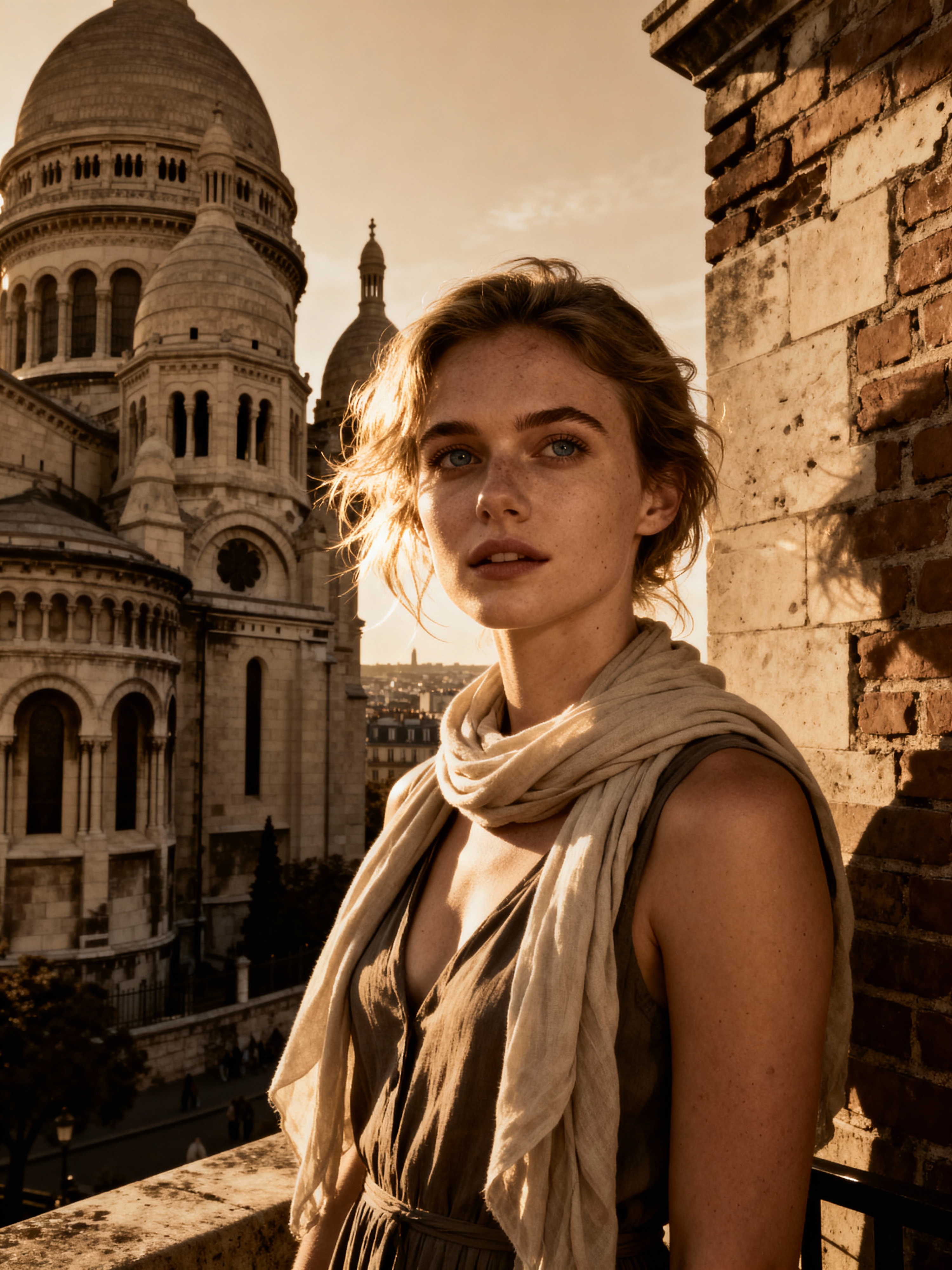 model at Sacré-Cœur Basilica, wearing a modest summer dress with light scarf , traditional architecture visible
