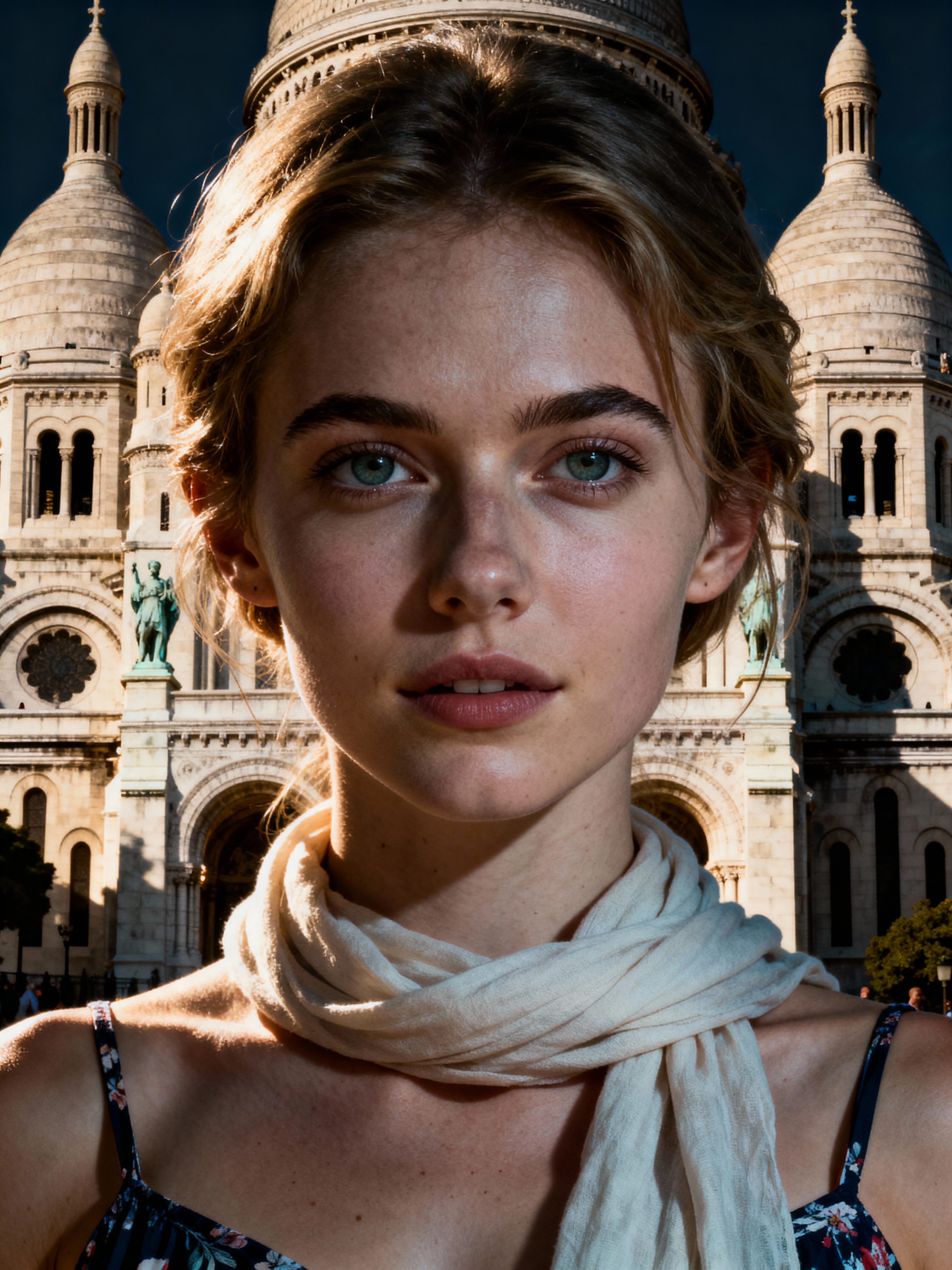 model at Sacré-Cœur Basilica, wearing a modest summer dress with light scarf , traditional architecture visible