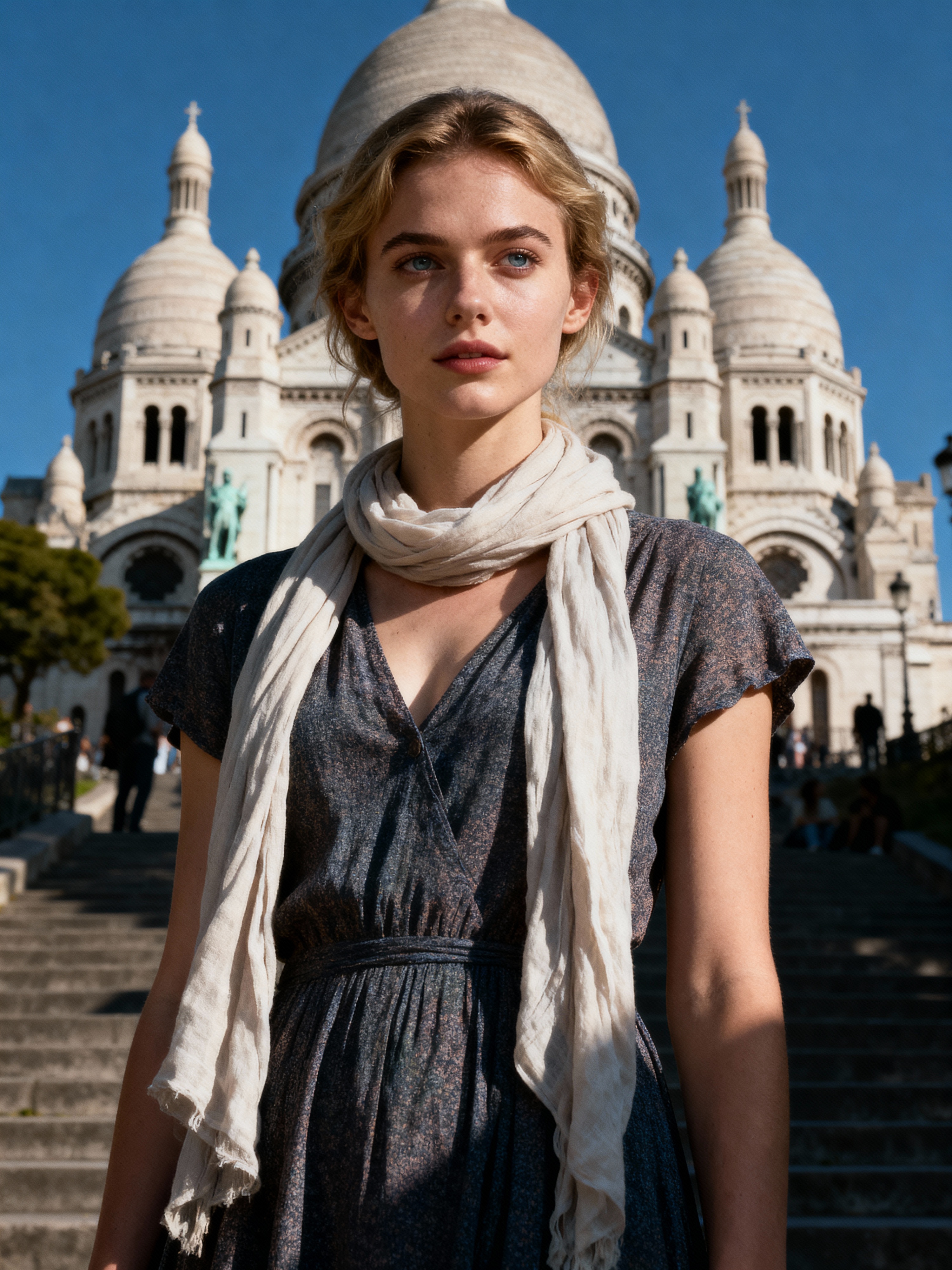 model at Sacré-Cœur Basilica, wearing a modest summer dress with light scarf , traditional architecture visible