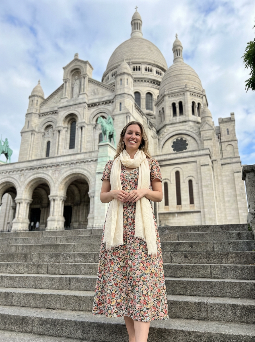 model at Sacré-Cœur Basilica, wearing a modest summer dress with light scarf , traditional architecture visible