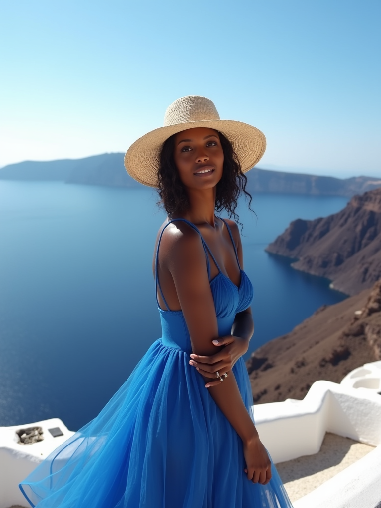 model at Santorini caldera viewpoint, wearing an elegant blue sundress with straw hat , panoramic volcanic views and clear blue skies