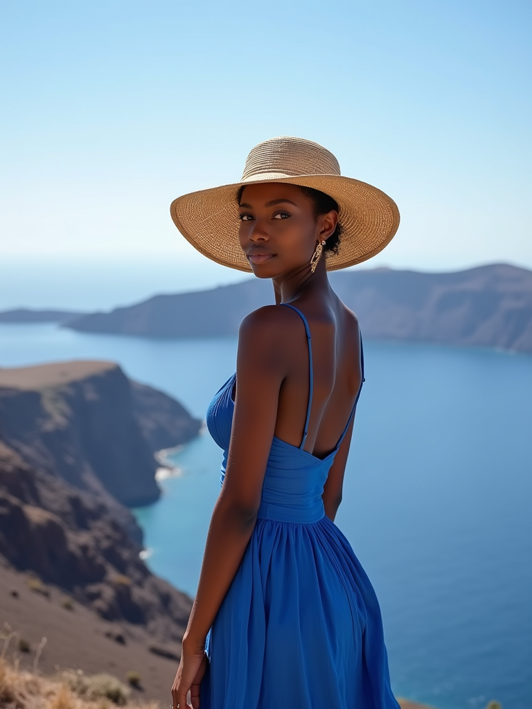 model at Santorini caldera viewpoint, wearing an elegant blue sundress with straw hat , panoramic volcanic views and clear blue skies