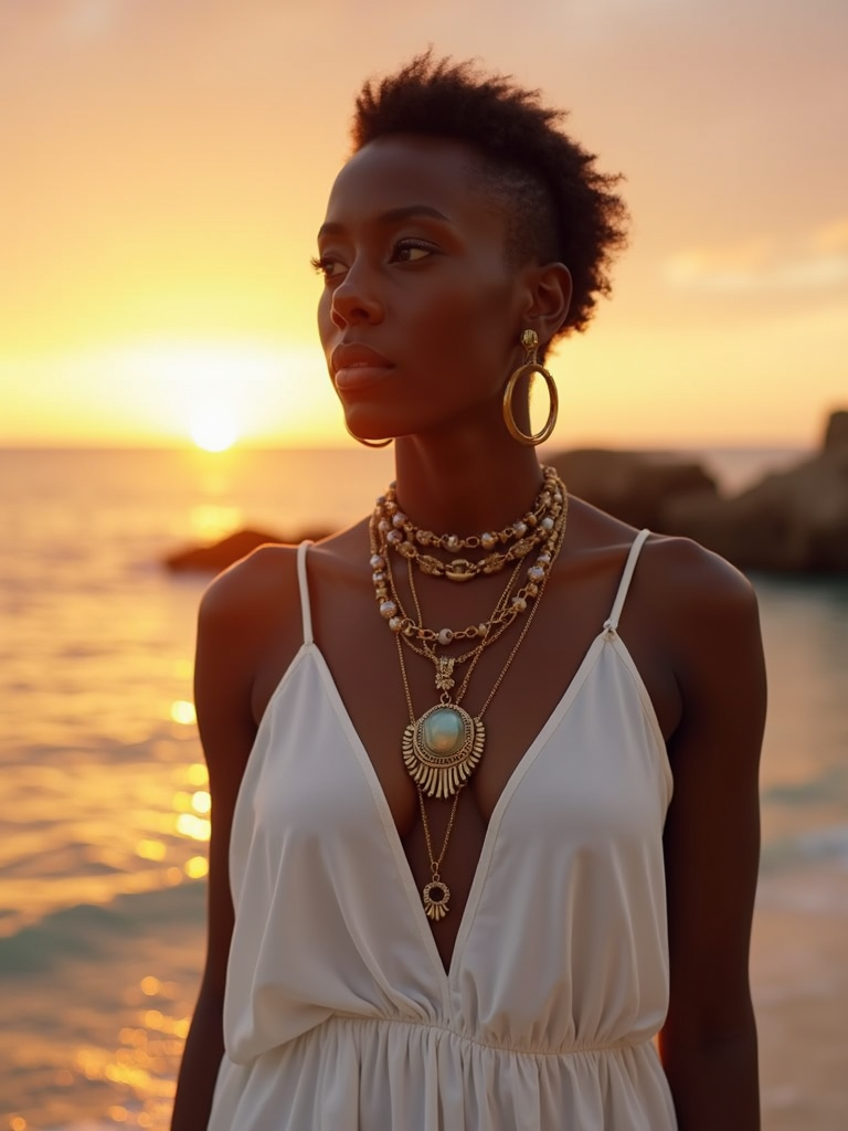 model at Scorpios beach club, wearing a bohemian white dress with layered necklaces , sunset over the sea