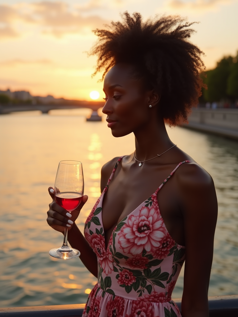 model at Seine River during sunset, wearing a elegant summer dress with floral pattern , holding a glass of wine