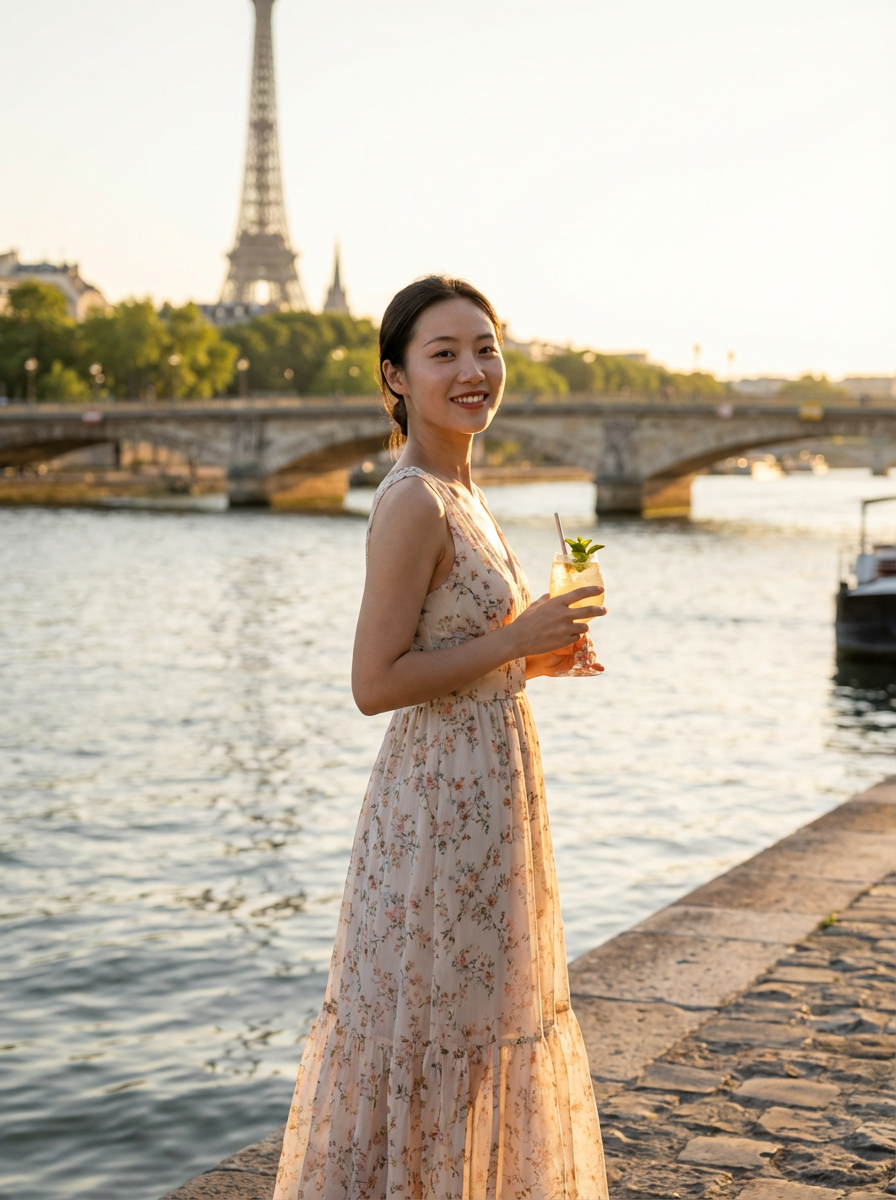 model at Seine River during sunset, wearing a elegant summer dress with floral pattern , holding a glass mocktail